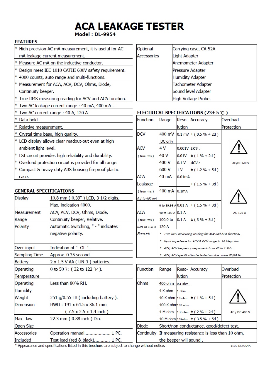 Product Name : | ACA LEAKAGE TESTER Model : DL-9954 洩漏電流測試鉤錶 |