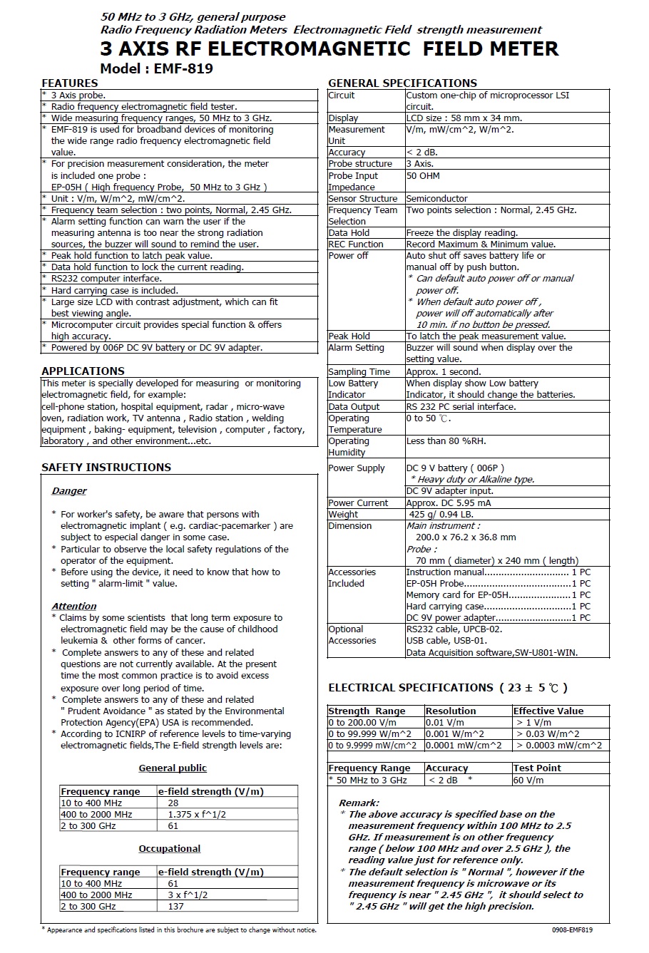 * EMF-819 is used for broadband devices of monitoring the wide range radio frequency electromagnetic field value.