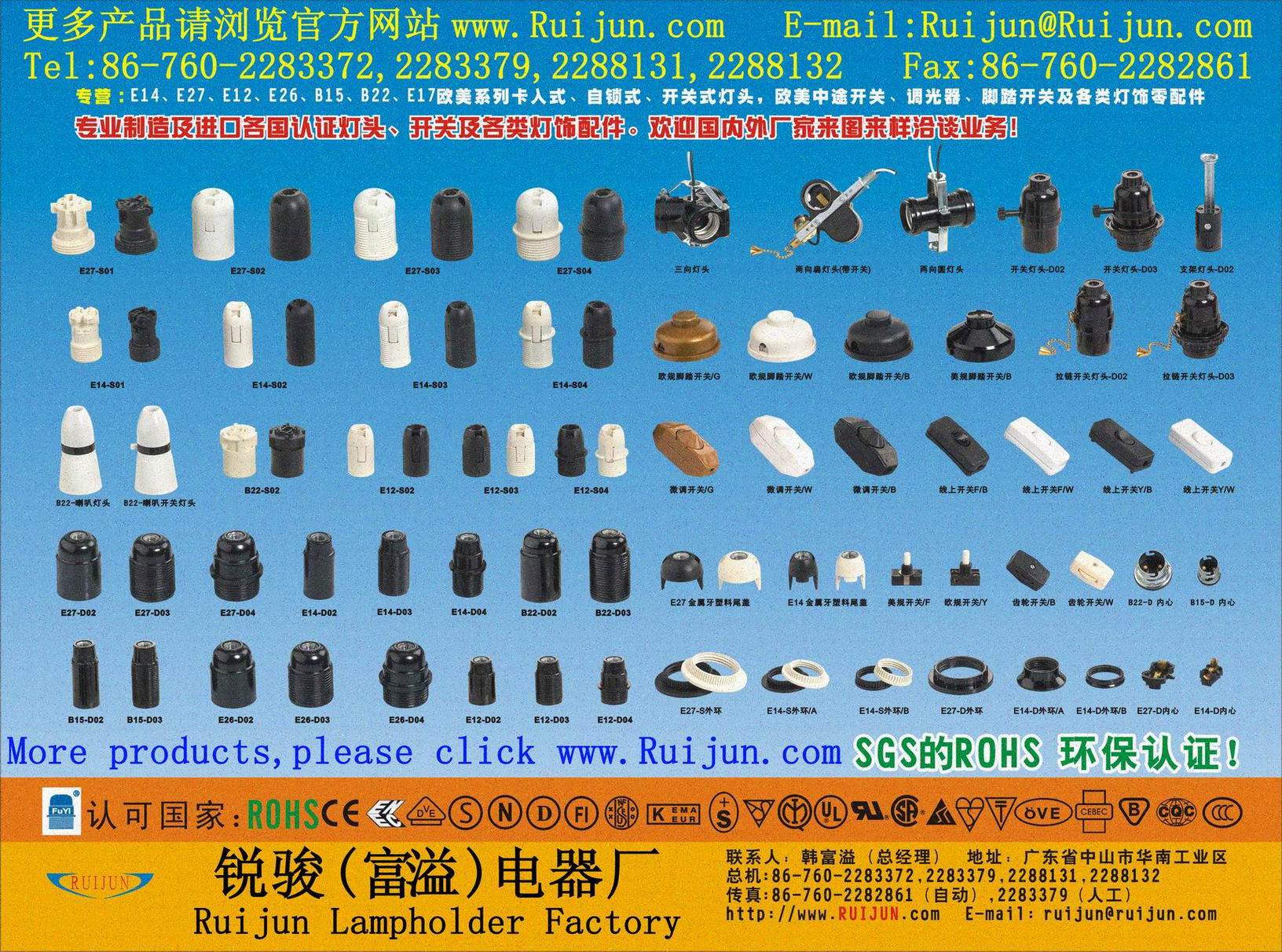 锐骏电器(www.ruijun.com原来的富溢电器)是一家专业制造和进口欧美各国认证灯头、开关、灯座(螺口、卡口)和各类灯饰配件的灯头灯座厂。