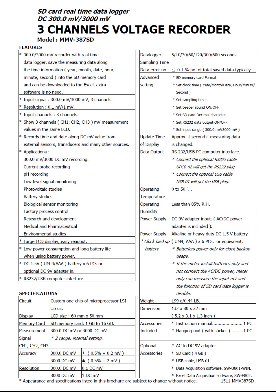 Product Name : 3 channels DC 300.0 mV/3000 mV VOLTAGE RECORDER Model : MMV-387SD 三通道記憶式電壓記錄儀