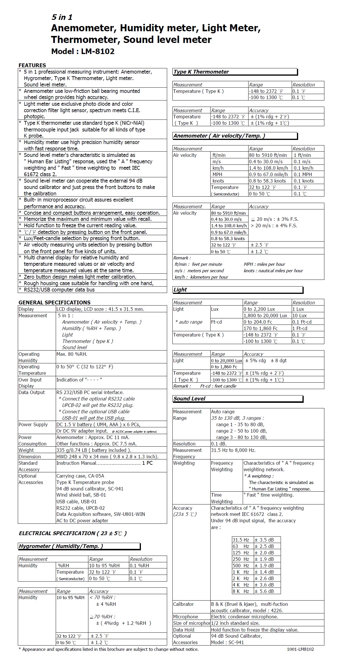 Product Name : | 5 IN 1 METER - LM-8102 五合一環境量測功能:風速/溼度/照度/溫度/噪音 |