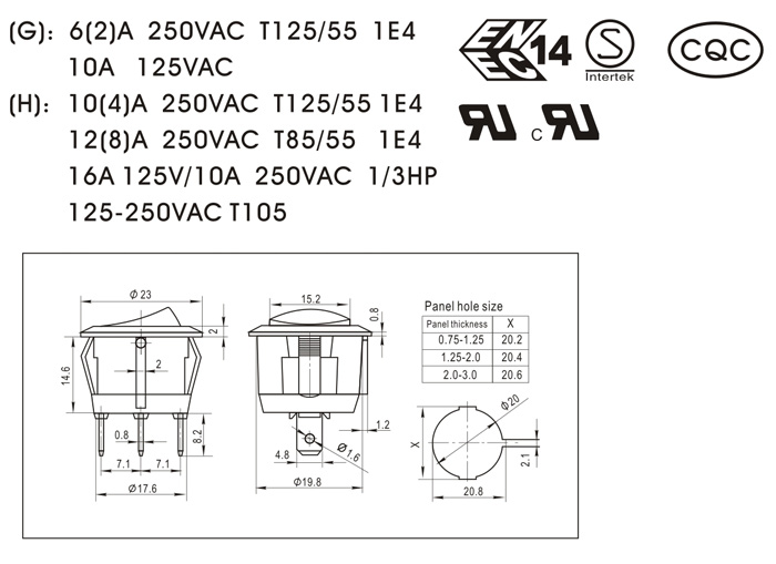 (G): 6(2)A 250VAC T125/55 1E4