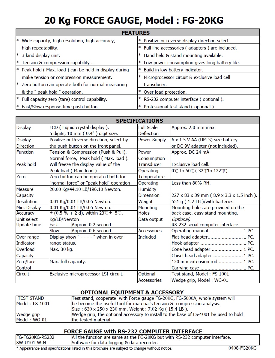 20 Kg FORCE GAUGE - FG-20KG   推拉力計