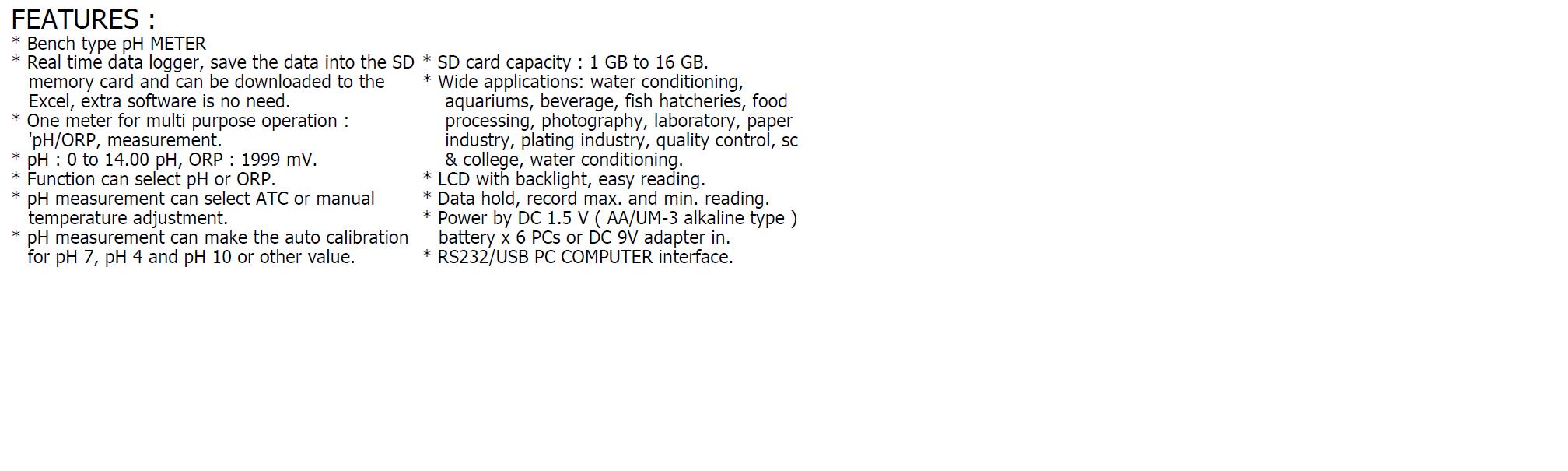 * pH : 0 to 14.00 pH, ORP : 1999 mV.