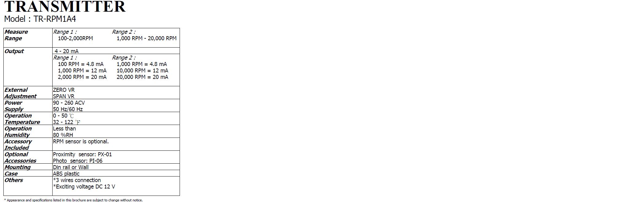 * Output : 4 to 20 mA, DC.