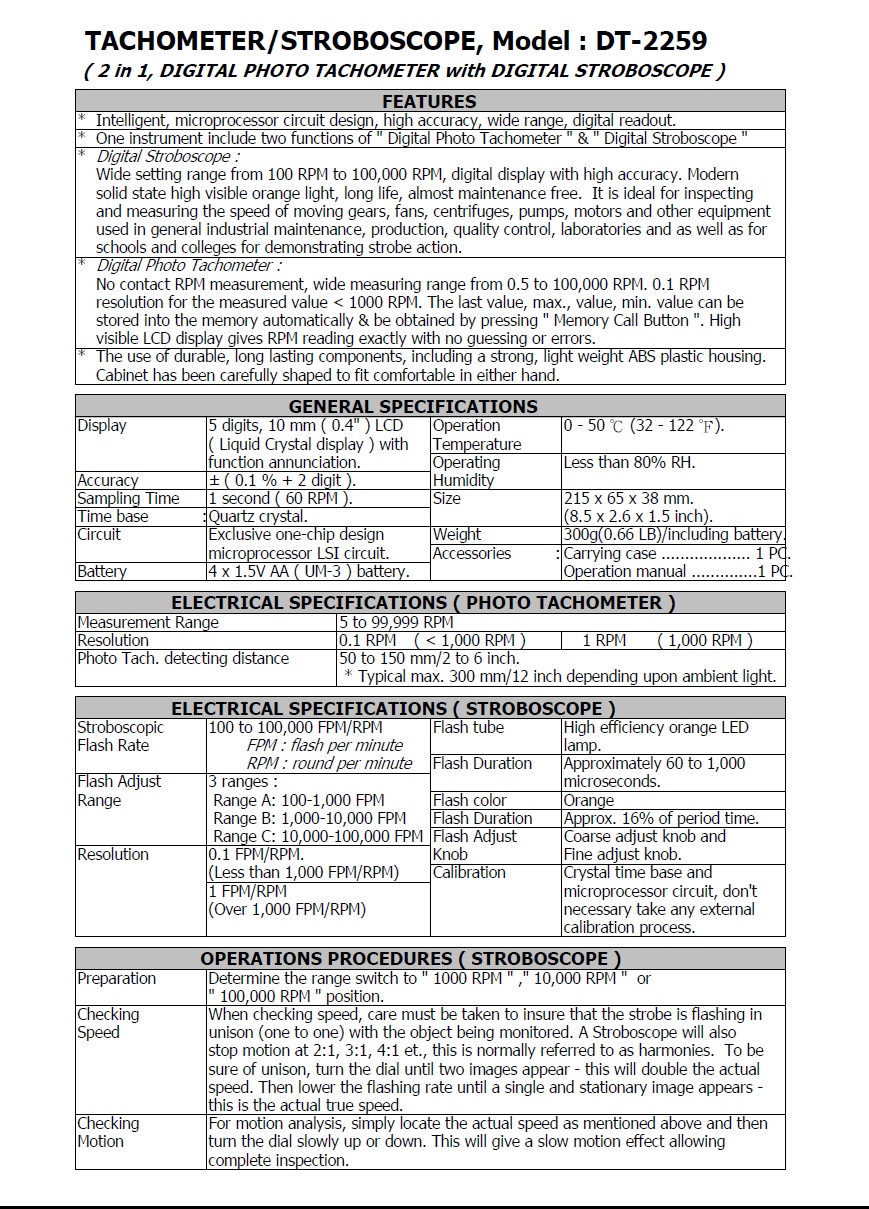 Product Name : | TACHOMETER/STROBOSCOPE - DT-2259 光電/閃頻兩用轉速計 |