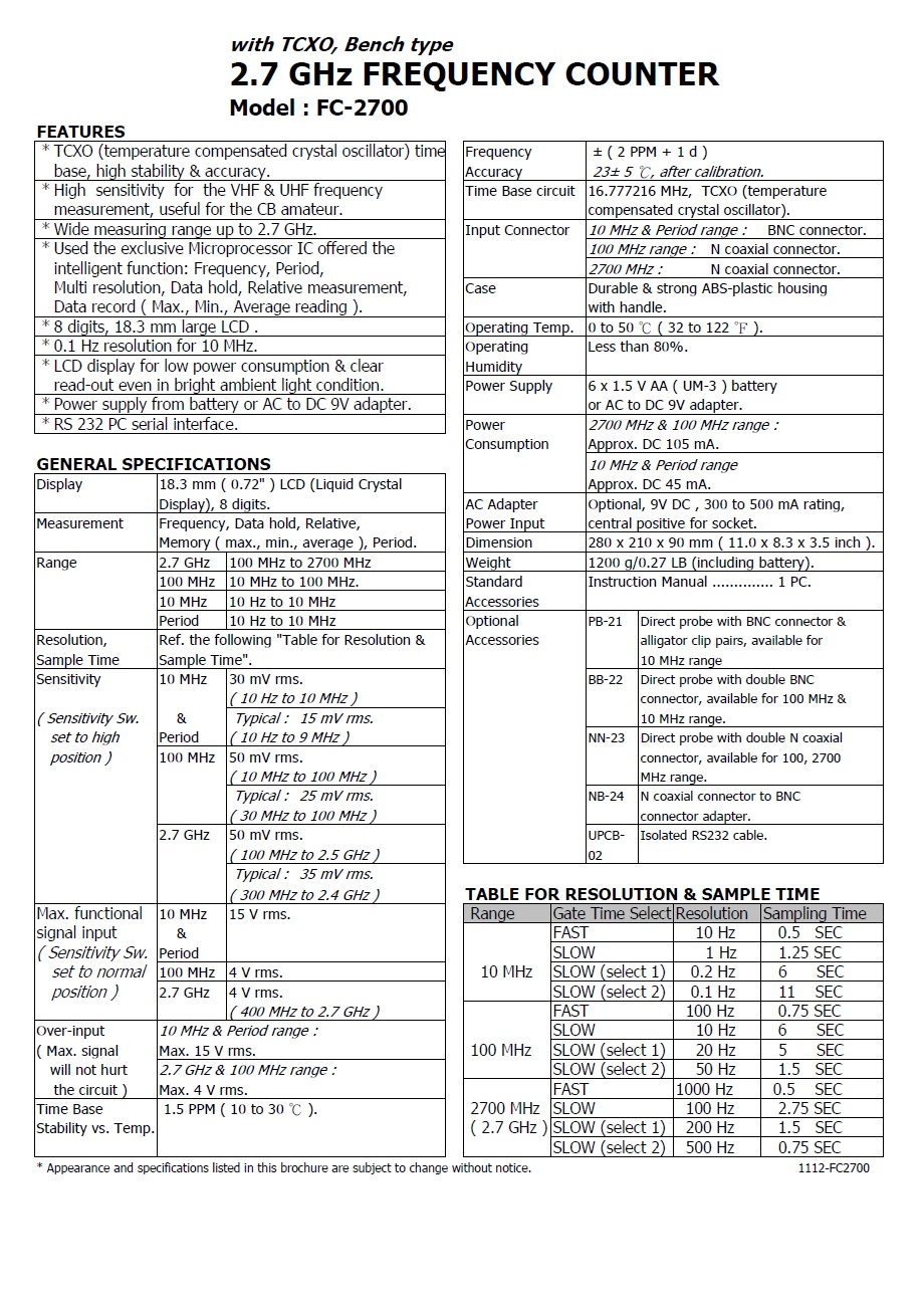 * Wide measuring range up to 2.7 GHz. * 0.1 Hz resolution for 10 MHz.