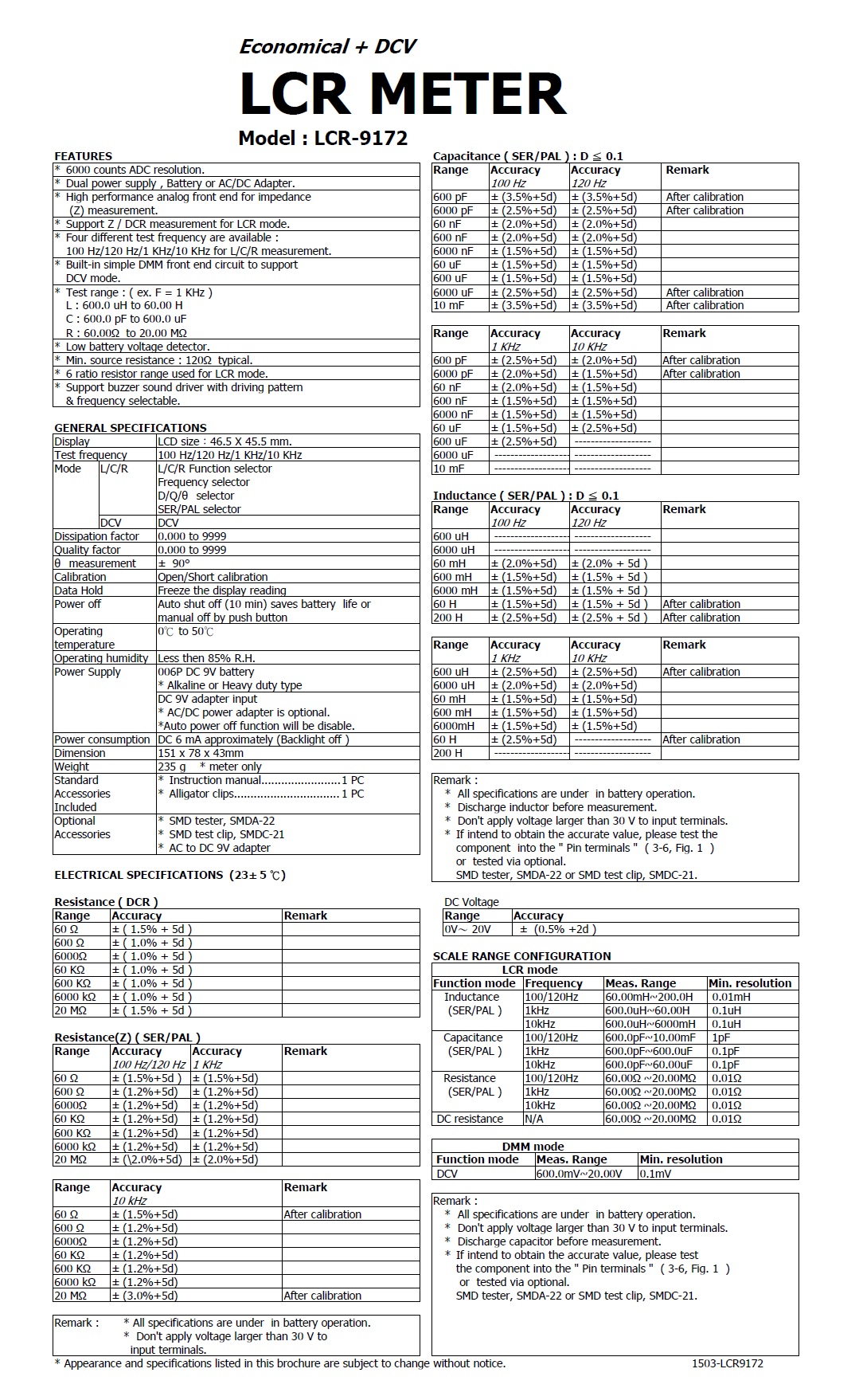 * DCR mode 60.0 to 20.00 M ohm.