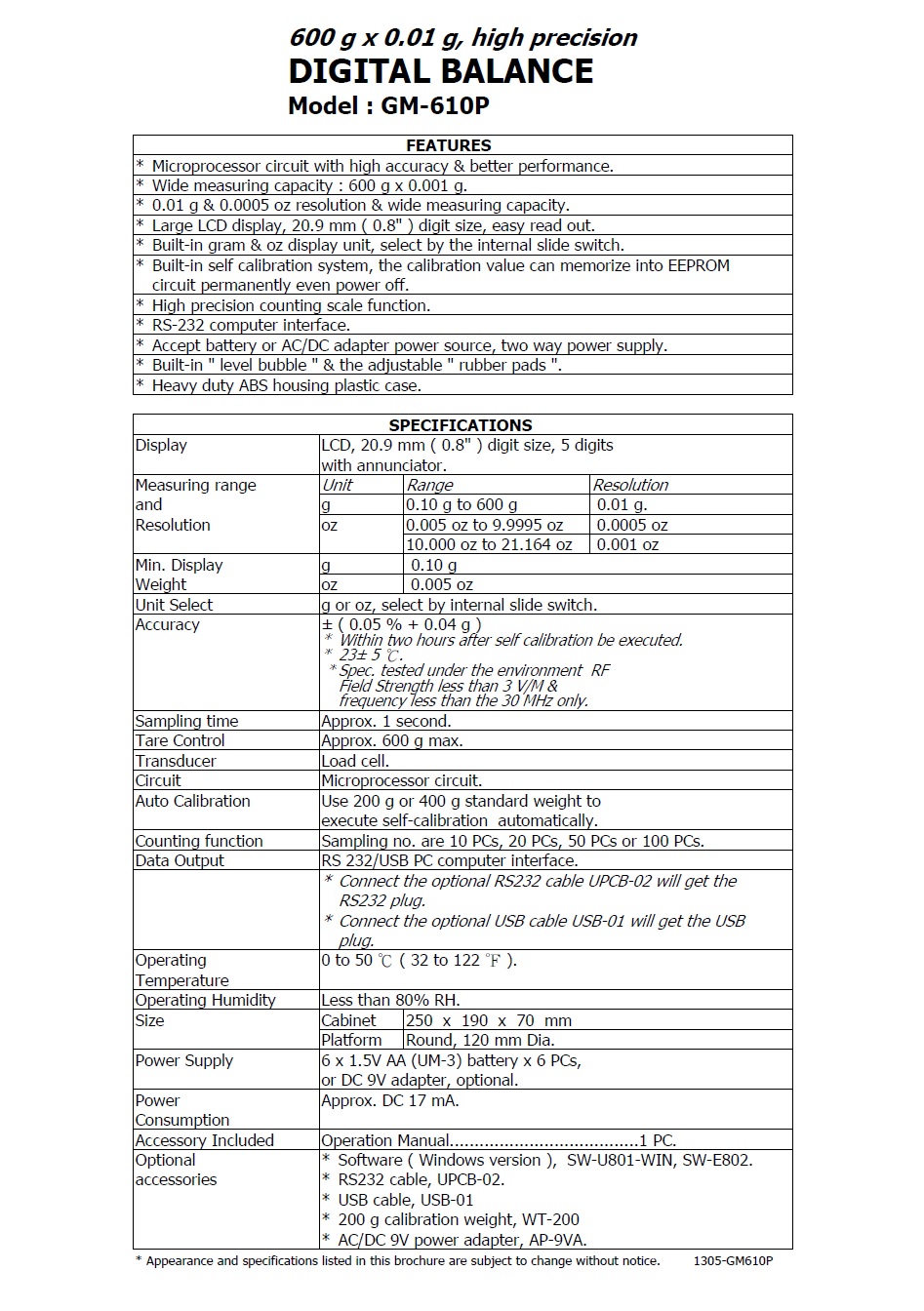 DIGITAL BALANCE	 Model : GM-610P   精密型電子秤