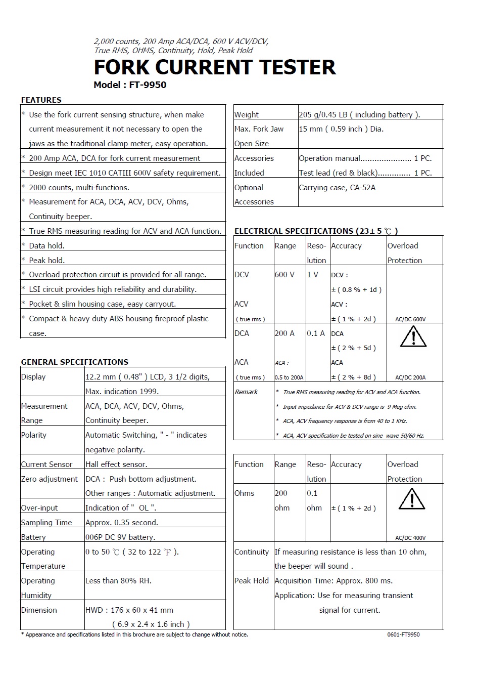 AC/DC FORK CURRENT TESTER - FT-9950  叉式電流錶 / 叉式多功能電流鉤錶